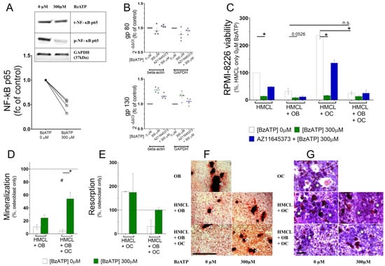 P2X7 receptor activation of transcription regulators and subsequent alterations in RPMI-8226–osteoblast and RPMI-8226–osteoclast interaction. (A) Western blot to show the nuclear factor-κappa B (NF-κB) phosphorylation using phosphorylation of NF-κB (p-NF-κB; p65) antibody and quantification of phosphorylated protein normalized to the total protein t-NF-kB (p65) after 90 min treatment with 300 µM BzATP. GAPDH was probed as a protein loading control. (B) TaqMan qPCR analysis showing the expression of gp80 and gp130 after 90 min treatment with BzATP (300 µM) alone, or after a 30-min pre-treatment with the antagonist (AZ11645373+ 300 µM), as indicated. Data shows change in mean ± SEM of four independent experiments (n) as a fold change of untreated control (0 µM); beta-actin and GAPDH were used as housekeeping genes. (C) Effects of RPMI-8266 treatment with 300 µM BzATP for 90 min before culturing with bone cells for 48 h in an in vitro co-culture assay. The effect on viability of RPMI-8266 (HMCL) in the presence of osteoblasts (HMCL+ OB), osteoclasts (HMCL+ OC), or both osteoblasts and osteoclasts (HMCL+ OB + OC) (D), and on mineralization and resorption (E). Data shows mean ± SEM of independent experiments and * = p < 0.05 by Mann–Whitney test comparing the effect of BzATP treatment or by Kruskal–Wallis comparison to compare the effect of bone cells, or # = p < 0.05 by Mann–Whitney comparison to baseline bone cell function (dotted line) as indicated (n = 3, RPMI-8266 viability; n = 4, mineralization; and n = 2, resorption). Representative images to show (F) Alizarin Red-stained mineralized nodules (white arrows heads) as a measure of osteoblast function (scale bar: 500 µm) and (G) resorption (white stars) on dentine discs as a measure of osteoclast function (scale bar: 100 µm; in vitro).
