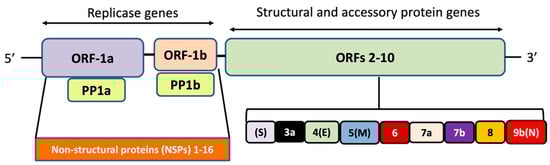 The SARS-CoV-2 genome has 10–12 putative open reading frames (ORFs) that encode non-structural proteins and structural proteins (Figure 1). The non-structural proteins (nsps) are involved in virus processing and replication, while the structural proteins help in the assembly and release of new viral copies. The structural proteins produced are, e.g., spike (S) protein, envelope (E) protein, membrane (M) protein, and nucleocapsid (N) protein []. The M protein is the most abundant, while the E protein is the smallest in size amongst all the four structural proteins. More specifically, the M protein acts as a central organizer in assembling and shaping the viral envelope by interacting with other structural proteins. It binds with S and N proteins for the completion of new viral assemblies. The E protein is abundantly expressed in the replication cycle in the infected cells, although a small portion of it is incorporated into the viral envelope and mainly contributes to the viral assembly and budding. The N protein exhibits its functions by interaction with the positive RNA strand of the viral genome, thereby forming a helical ribonucleocapsid complex. It also interacts with other structural membrane proteins during the assembly of virions. The S protein is important for the attachment and entry of SARS-CoV-2 into host cells [].