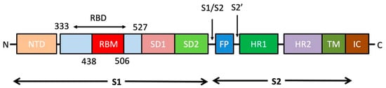 The overall topology of the SARS-CoV-2 S monomer. FP, fusion peptide; HR1, heptad repeat 1; HR2, heptad repeat 2; IC, intracellular domain; NTD, N-terminal domain; SD1, subdomain 1; SD2, subdomain 2; TM, transmembrane region [].