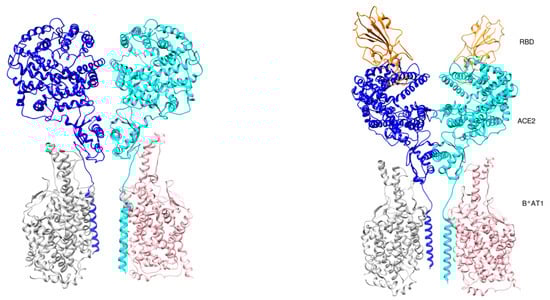 Angiotensin-converting enzyme 2 (ACE2) conformations. (Left) Open conformation (PDB id 6m1d). (Right) Close conformation (PDB id 6m18). RBD is shown in orange color. ACE2 chains are shown in cyan and blue colors, while B0AT1 chains are shown in pink and grey colors.