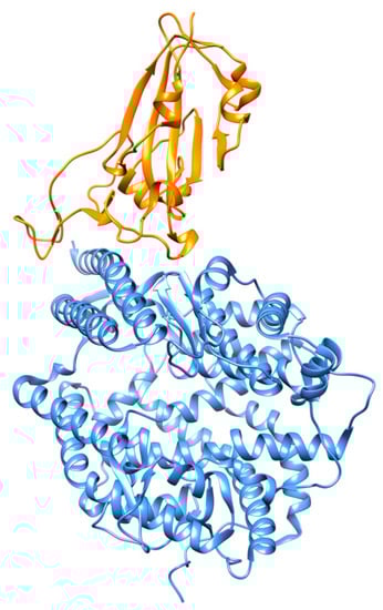 During the infection, the S protein in its trimeric form is cleaved into subunits S1 (“head”) and S2 (“stalk”) (Figure 2) []. S1 is responsible for receptor binding, whilst S2 is responsible for membrane fusion. The ACE2 protein, a key regulator of the renin-angiotensin system [], acts as the cell entry receptor of SARS-CoV-2 into human cells. S1 protein contains a receptor-binding domain (RBD; ~22 kDa), which interacts with the peptidase domain (PD) of the ACE2 through a receptor-binding motif (RBM) and an N-terminal domain (NTD) whose function is still not well understood. Although the role of NTD is yet unclear, it might be involved in recognition of specific sugar moieties upon initial attachment for the transition of S protein from prefusion to postfusion state as reported in some coronaviruses.