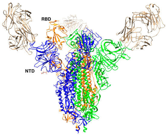 Crystal structure of SARS-CoV-2 RBD with 4A8 (PDB id 7c2l). The RBD in the “up” conformation is labelled. The trimer is colored in blue (B), green (C), and orange (A). The three 4A8 antibodies, each bound to an NTD, are shown in brown.