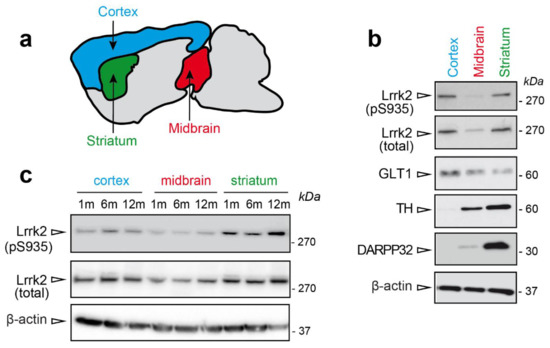 To explore LRRK2 phosphorylation in mouse brain, we dissected three brain regions, namely striatum, cortex, and midbrain (Figure 1a). These areas are relevant in PD pathology [14] and LRRK2 was previously shown to be highly expressed in striatum and cortex [15,16]. Here we confirmed that Lrrk2 steady state levels are higher in the cortex and striatum compared to midbrain (Figure 1b), while the levels of phosphorylated Ser935 are higher in striatum compared to the other regions (Figure 1c). In addition, the lower Lrrk2 expression in the midbrain appears age-independent (Figure 1c).