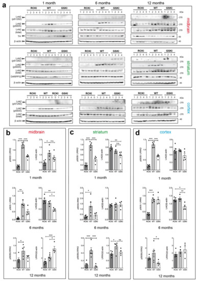 Last, we observed some differences in Lrrk2 steady state levels across genotypes, but without a consistent trend in one specific region or at a specific age, with the exception of 6 months mice were total Lrrk2 levels are lower in GSKI cortex and midbrain (Figure 2a–d).