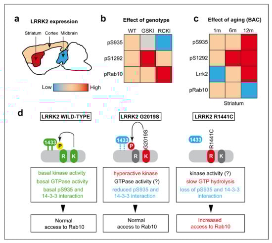 The differential impact of LRRK2 mutations on Rab10 phosphorylation in brain. (a) Schematic representation of LRRK2 protein levels in cortex, midbrain, and striatum. (b) LRRK2 and Rab10 phosphorylation levels as function of LRRK2 common mutations (G2019S and R1441C) and (c) as function of ageing in murine BAC-Lrrk2-G2019S mice. (d) Schematic summary of the possible molecular mechanisms underlying the different levels of Rab10 phosphorylation in presence of wild-type or mutated LRRK2. In detail, our data suggest that in the presence of the R1441C-LRRK2 mutation, the reduced phosphorylation at Ser935 may lead to a reduction of LRRK2-14-3-3s binding and thus to an increased access to Rab10.
