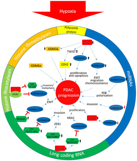 miRNA-142 is also down-regulated in PDAC cell lines as well as in PDAC tissues and its expression is inversely correlated with the expression of HIF-1α. In further experiments, a binding of miRNA-142 to the 3′UTR of HIF-1α and a participation of the miRNA-142/HIF-1α axis in the invasion and proliferation of PDAC cells under hypoxic conditions was shown. The analysis of 42 cancer tissues revealed a correlation of HIF-1α and miRNA-142 expression with disease stage and a correlation of miRNA-142 expression with lymphatic metastasis [46]. A summary of the non-coding RNAs involved in hypoxia-mediated cancer progression is given in Table 1.