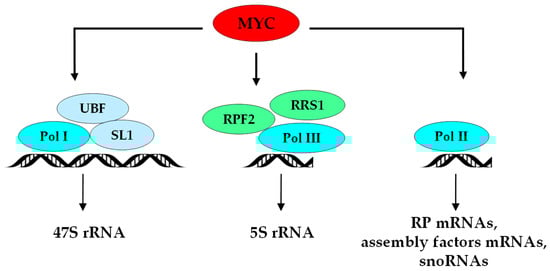 Cancer cells are characterized by constitutive activation of growth signals which alter the activity of major cell cycle regulating transcription factors [49,50], and the increase in ribosome biogenesis in cancer cells has been extensively linked to the sustained activation of RNA polymerases I and III by these cell cycle transcription factors [51,52]. However, in addition to regulating rDNA gene transcription, some oncogenic transcription factors have been shown to coordinate the overall ribosome biogenesis process. For example, the proto-oncogene MYC represents an active hub toward tumorigenesis [50]. Indeed in cancer cells, MYC plays a major role in the production of ribosomes, through the direct activation of rRNA synthesis but also of a gene network which includes genes encoding all rRNA processing factors, RPs, and factors implicated in the translation machinery [53,54,55,56]. The direct binding of MYC to rDNA activates RNA pol I-mediated synthesis of the 47S rRNA precursor [57]. MYC also activates RNA pol II transcription of genes coding for ribosomal assembly factors and for RPs, as well as that of RNA pol III of 5S rRNA [58]. Therefore, the increase in ribosome biogenesis by MYC is not solely restricted to the activation of rDNA transcription but is also mediated by MYC-induced upregulation of RP gene expression. The crucial causal tumorigenic impact of these coordinated transcriptional activations has been elegantly demonstrated in mouse models exhibiting haploinsufficiency for RP genes [59]. As an example, increased expression of RPL14 and RPL28 induced by MYC over-expression in vivo is a major event in lymphoma progression, leading to impaired translation of the cell cycle regulator cDK11, genomic instability, and defective mitosis that directly contribute to lymphomagenesis [59,60]. Interestingly, the combination of chemical inhibitors of ribosome biogenesis and of the mechanistic targeting of the rapamycin (mTOR) signaling pathway, the main driver of lymphomagenesis [61], has proven to be very powerful at inhibiting tumor growth of MYC-driven B-cell lymphoma in vivo in mouse models [62]. Thus, the uncontrolled activity of MYC observed in many types of cancers exacerbates ribosome biogenesis and promotes aberrant translation that sustains tumor progression [63,64]. Additional oncogenes such as mTOR, PI3K, and Akt were also shown to activate rRNA synthesis partly by directly interacting with the formation of the rDNA preinitiation complex (PIC) [63]. Conversely, tumor suppressors including TP53, PTEN, and RB are very potent ribosome biogenesis suppressors [51,52], regulating various levels from rDNA transcription and processing to RPs and accessory factor expression [64].