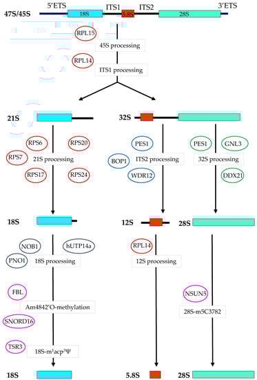 Schematic representation of ribosome biogenesis factors upregulated in colorectal cancer cells and their known sites of regulation of pre-rRNA processing pathways. The production of mature 18S, 5.8S, and 28S result from the synthesis and processing of a single 47S rRNA precursor characterized by noncoding 5′ and 3′ external transcribed spacers (ETS) and internal transcribed spacers (ITS1 and ITS2). In colorectal cancer cells, overexpression of the 45S rRNA is a biomarker of poor prognosis [87]. RPL15 is involved in pre-rRNA processing at the internal transcribed spacer 1 (ITS1) site of the 47S pre-rRNA and is overexpressed in CRC [148]. RPL14 controls the processing of the 45S pre-rRNA and 12S rRNA and is highly expressed in CRC [140]. RPS6, RPS7, RPS 17, RPS20, and RPS24 are involved in the formation of the 18S rRNA and are overexpressed in CRC respectively, in References [132,139,141,142,150]. Pescadillo homolog 1 (PES1), block of proliferation (BOP1), and WD-repeat domain 12 protein (WDR12) are involved in the formation of the 12S rRNA and overexpressed in CRC respectively, in References [113,122,130]. PES1 is also involved with DDX21 and GNL3 in the processing of the 32S to the 28S rRNA and GNL3 is overexpressed in CRC [116]. RPL14, which is overexpressed in CRC [141], further activates the processing of the 12S rRNA to mature 5.8S. 18S pre-rRNA processing is activated by NIN1 (RPN12) binding protein 1 homolog (NOB1) in cooperation with “partner of NOB1” (PNO1) which is overexpressed in CRC [151]. 18S pre-rRNA processing is also activated by human U3 protein (UTP) 14a (hUTP14a), and is overexpressed and constitutes a marker of poor prognosis in CRC [152]. Base and nucleotide modifications are important modifications that control late steps of rRNA maturation. The human nucleolar enzyme NSUN5 catalyzes the C5 methylation of cytosine residue C3782 of the 28S rRNA (18S-m5C3782) and is upregulated in CRC and associated with disease progression [153]. The C/D-Box small nucleolar RNA 16 (SNORD16) guides fibrillarin (FBL) to methylate the 2′O-ribose on the 18S-Am484 site and constitutes a molecular marker of CRC and a driver of colorectal tumorigenesis [154]. The ribosome biogenesis protein TSR3 induces the 1-methyl-3α-amino-α-carboxyl-propyl pseudouridine (m1acp3Ψ) modification on uridine U1248 of the 18S rRNA and is overexpressed in CRC and associated with colorectal tumorigenesis [155].