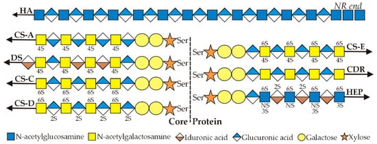 All GAGs are linear chains comprised of repeating disaccharide units, each containing a uronic acid (i.e., glucuronic or iduronic) and an N-acetylamino sugar (i.e., glucosamine or galactosamine). All GAGs except HA are synthesized by multiple enzymes via specific linkages to one of at least 28 different Core Proteins [4,5].