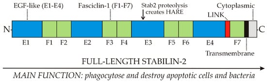 Kim, Park and colleagues have extensively and elegantly characterized the receptor domains involved in the recognition of phosphatidylserine (PS) and integrins [18,19,20,22]. Three cell-associated molecules that are ligands for Stab2-mediated engulfment have been identified: PS, αMβ2 integrin and αvβ5 integrin. PS binding sites are within the four Epidermal Growth Factor (EGF)-like domains E1-E4; integrin-binding sites are within the seven Fasciclin domains, F1–F7.