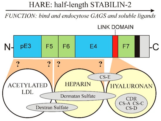 All GAG and other soluble ligand-binding domains are within the HARE portion of Stab2. The half-receptor HARE isoform (1416 aa) is the C-terminal half of Stab2 and contains the CD (gray), membrane (black) and Link (red) domains, as well as Fasciclin-1 domains F5–F57 and EGF-like domain E4 of the full-length protein (Figure 2). The N-terminal region of HARE is a truncated portion of the Stab2 E3 domain (pE3). All known GAG binding sites (yellow circles and gray ellipses) are within HARE [24,25]. The Link module enables binding to HA, CDR, CS-A, CS-C and CS-D (right yellow circle); these four CDR GAGs inhibit HA binding and Link module deletion eliminates all five binding activities [26]. A separate Hep binding site is on the N-terminal side of the Link domain. A third independent binding site for acetylated low-density lipoprotein (AcLDL; white circle), is assigned to the N-terminal side of the Hep site. Based on competition studies [26], DS binds to or occludes the Hep binding site and partially blocks both HA and AcLDL binding. DxS competes with both Hep and AcLDL binding but does not block HA binding. CS-E competes at a low level with both HA and Hep but does not affect AcLDL binding.