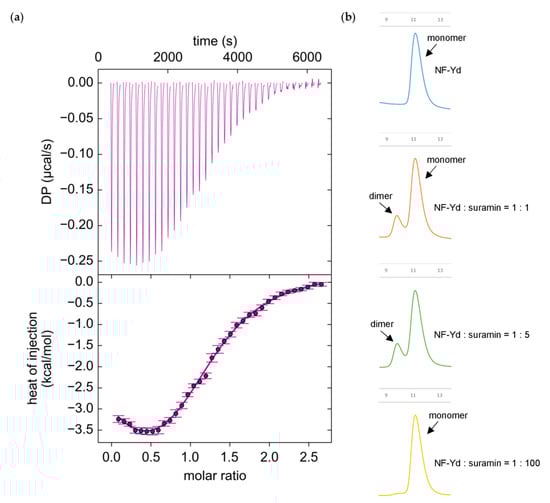 The thermogram exhibited a biphasic behavior, indicating the occurrence of at least two binding events. Since it is known that suramin can induce the dimerization of its receptors [55,56], in order to determine the appropriate binding model for fitting ITC data we analyzed the oligomerization state of NF-Yd as a function of the suramin relative concentration by gel filtration (GF) (Figure 2b). In the presence of equimolar concentration or low excess of suramin (fivefold more than the protein), the GF chromatograms displayed a second elution peak, compatible with the formation of a NF-Yd protein dimer. This peak was not present at high suramin molar excess (100-fold more than the protein). Therefore, it appears that at low (limiting) concentrations suramin promotes dimerization of NF-Yd, while at high molar ratios suramin saturates all NF-Yd molecules, preventing NF-Yd dimer formation.