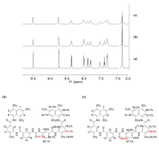 Saturation-Transfer Difference (STD) Nuclear Magnetic Resonance (NMR) experiments on suramin–NF-Y complexes; (a) 1H-NMR spectrum of suramin 1 mM; (b) STD NMR spectrum of a mixture of suramin (1 mM) and NF-Yd (25 µm); (c) STD NMR spectrum of a mixture of suramin (1 mM) and NF-Yt (25 µm). All samples were dissolved in 10 mM Tris-DCl, 150 mM NaCl, pH 8, and analyzed at 25 °C and 600 MHz. The 1H-NMR spectra were recorded with 64 scans and the STD NMR spectra with 1024 scans and 3-s saturation times; (d) binding epitopes of suramin to NF-Yd, and (e) trimer obtained for 0.6-s saturation time. The largest relative STD intensity was scaled to 100%. Values are referred to half molecule and are intended duplicated symmetrically. Values in red refer to protons whose overlapping prevented the discrimination of their single contribution.