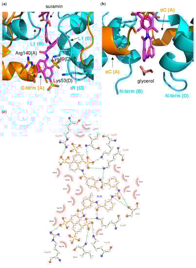 In particular, the charges of two out of the three sulfonates are compensated by Arg(C)140, and Lys(B)49/Lys(B)53, while the third –SO3− points toward the solvent. Lys(B)49 also interacts with the carbonyl oxygen of the carbonylimino group linking the naphthalene ring and the benzene ring of suramin (Figure 5c). The other half of the suramin molecule binds to the corresponding protein regions of the A, B, and D chains, respectively. Overall, the suramin molecule fits well at the dimeric interface of the two NF-Yd molecules. A further suramin interaction is provided by a glycerol molecule from the cryoprotectant solution, which is symmetrically hydrogen-bonded to both the NH groups of the functional urea moiety (Figure 4a and Figure 5b,c).