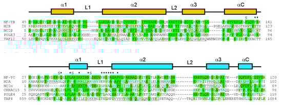 Due to its large, flexible, and multifunctional nature, suramin tends to be a nonselective drug. In the case of NF-Y, an issue may be its interaction with other HFD-containing proteins [74]. Sequence alignment of NF-YB and NF-YC with other human HFD-containing proteins indicates that the NF-Y suramin-binding site is lined by residues that are partly conserved (Figure 6). The conservation is located to NF-YC α1 and α2 and NF-YB L2, while differences are present at the NF-YC N-terminus and L1 and at the NF-YB C-terminus; based on our crystallographic data, these latter regions line the glycerol-binding cleft. Such areas with low sequence homology with other HFD proteins could be used to drive chemical modifications on suramin to generate either symmetrical or asymmetrical compounds that can improve ligand-binding affinity, and/or selectivity.