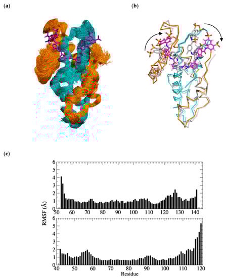 Molecular dynamics (MD) simulations of the NF-Yd–suramin complex; (a) superimposed frames (one per ns) for the last µs of simulation (orange NF-YB, cyan NF-YC, and magenta suramin); (b) structural superposition of the middle structure of the most populated cluster of the MD simulations (color code as in panel (a) with the crystal structure of the complex (grey)). The readjustment of the two naphthalene rings to optimize the interactions with the single NF-Yd molecule are highlighted by arrows; (c) root mean square fluctuations (RMSF) per NF-YB and NF-YC residues (upper and lower panels, respectively).