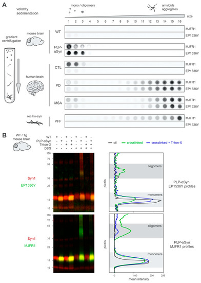 Unlike in MSA and PD, S129-phosphorylated human α-syn is oligomeric and monomeric in PLP-αSyn mouse brains. (A) Aggregation profiles obtained by sedimentation of the different species of α-syn found in WT or PLP-αSyn mouse brains (top), control, PD and MSA human subject brains (middle) or a preparation of recombinant human α-syn PFF (bottom). Pooled mouse (n = 3) or human (n = 3) brain homogenates and PFF samples were subjected to SarkoSpin solubilization followed with fractionation by sedimentation velocity upon ultracentrifugation on iodixanol gradient. The distribution of human α-syn (MJFR1) and pS129-α-syn (EP1536Y) was analyzed by filter trap on the collected fractions (numbered from top to bottom of gradient) followed by immunostaining with the respective antibodies. Pictures are representative of n = 3 independent sedimentations quantified in Supplementary Figure S2. (B) Representative western blot pictures (left) and their intensity quantification (right) of WT/PLP-αSyn mouse brains samples. Cytosolic fractions from pooled 9 months-old WT (n = 3) or age-matched PLP-αSyn (n = 3) brain homogenates were treated or not with Triton-X (0.25%, 30 min on ice) followed by crosslinking or not with DSG (2 mM, room temperature). These samples were subjected to SDS-PAGE electrophoresis and immunoblotted with couples of antibodies directed against total α-syn (syn1, red) and pS129-α-syn (EP1536Y, green, top) or human α-syn (MJFR1, green, bottom) using infrared dyes labelled secondary antibodies. Signal intensity of pS129-α-syn (top) and human α-syn (bottom) were quantified vertically by line scanning for PLP-αSyn samples untreated (black), DSG-crosslinked (green) or with prior Triton-X treatment (blue). Monomeric (light) and oligomeric (dark) species of the two forms of the proteins are depicted with the grey zones.