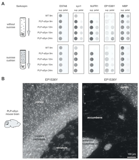 With regard to their localization in OLs and to the impact of Triton-X, we reasoned that a possibility could be that the pS129-positive monomers and oligomers seen in the transgenic animals could be associated with myelin. To address this hypothesis, we simply ran again the ultracentrifugation separation experiments shown in Figure 1B but removing this time the sucrose cushion meant to float the myelin sheath contaminants present in the brain extracts (Figure 3A). As expected, Figure 3A shows that omission of the sucrose cushion in the separation procedures resulted in a drastic enrichment of the pellet fraction with myelin basic protein (MBP) indicative of myelin sheath sedimentation. The presence of the latter myelin contaminants coincided with the appearance and the reinforcement of a pellet signal (i) for EP1536Y that detects S129-phosphorylated α-syn, (ii) for the anti-synuclein antibodies syn1 and MJFR1 both capable of detecting the human α-syn overexpressed by the OLs, (iii) but not for D37A6 that detects only the endogenous mouse α-syn expressed in neurons. Quantifications of the dot blots shown in Figure 3A are shown in Supplementary Figure 3. These results are compatible with the idea that the pS129-positive monomers and oligomers seen in the transgenic animals can get associated with myelin. They also suggest that previous studies in which no specific care was taken to manage myelin contaminants could have been confounded, the latter “dragging along” soluble monomer and oligomers of α-syn into the pellet.