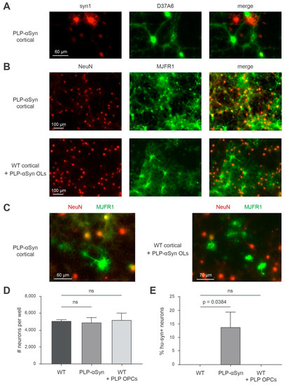 The presence of neuronal human α-syn in PLP-αSyn primary cortical cultures is not due to an OL-to-neuron transfer of the protein. (A) Representative immunofluorescence imaging of total α-syn (syn1, red) and endogenous murine α-syn (D37A6, green) in primary cortical cultures PLP-αSyn mouse. (B) Representative immunofluorescence imaging of neurons (NeuN, red) and human α-syn (MJFR1, green) in primary cortical cultures from PLP-αSyn mouse (top) or WT mouse supplemented with PLP-αSyn oligodendrocytes (bottom). (C) Close-up representative illustrations of the merged pictures shown in B. (D) Bar graph of the quantifications of the number of neurons (NeuN+ cells) per well. Equal averages of approximately 5000 neurons were obtained, with no significant differences between conditions (Holm-Sidak corrected multiple t-tests), ns: not statistically different. (E) Bar graph of the quantifications of the ratios of human α-syn positive neurons (hu-syn+ NeuN+/NeuN+ cells) per well in the three different culture conditions. After thresholding out the residual unspecific nuclear staining yielded by MJFR1, these cells are detected solely in PLP-αSyn primary cortical cultures (p-Values obtained with Holm-Sidak corrected multiple t-tests). For each condition 9 fields corresponding to 5.13 mm2 that is, 15% of the total well surface, of 2 independent wells were analyzed. Results are representative of 3 independent experiments.