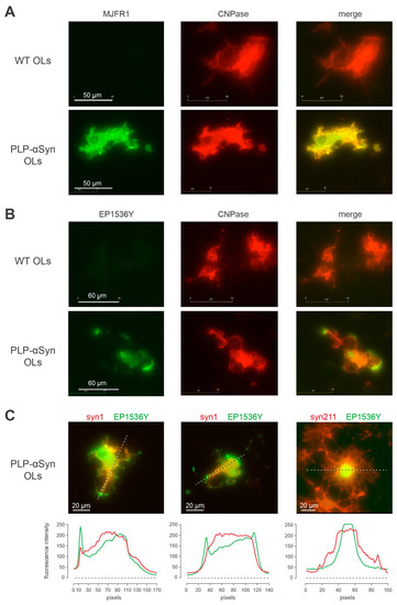 As previously reported using immunohistochemistry [14], double immunofluorescence (Figure 1A) revealed that the OLs populating the brains of PLP-αSyn mice express high levels of human α-syn (Figure 1A, MJFR1 panel). Indicative of a massive overexpression, human α-syn levels in OLs are so high that they account on their own for total brain α-syn levels 500% to 800% higher than in wild-type animals [34]. Thus, image acquisition adapted to detect α-syn in the OLs of PLP-αSyn mice with the species-independent antibody syn1 (Figure 1A, syn1 panels) leaves the endogenous physiological α-syn neuronal signal in the background. Similarly, these acquisition conditions for syn1 also yield a completely dark image for control animals (Figure 1A). In PLP-αSyn mice most of the OLs are also positive for EP1536Y that detects S129-phosphorylated α-syn (Figure 1A, EP1536Y panel). In these conditions brain sections from WT animals are totally negative for EP1536Y (Figure 1A).