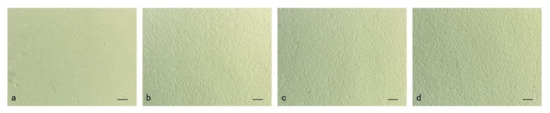 Micrographs of Japanese flounder muscle cells in primary culture; bar = 100 µm. (a) 1 day after seeding, sticking to the wall and extension of muscle cells were observed; (b) 3 day after seeding, completely stretching and proliferation were observed; (c) 4 day after seeding, the cells reached a fusion rate of 80–90%; (d) 5 day after seeding, the cells overspread the culture bottle bottom.