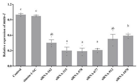 Six siRNAs and scrambled siRNA were evaluated for their mstn-1 gene silencing efficiency in Japanese flounder muscle cells to screen the most effective siRNA duplex. The scrambled siRNA (simstn-1-NC) did not affect the expression of mstn-1 compared with the control group. All six siRNAs showed significant reductions (p < 0.05) in the level of mstn-1 mRNA compared to the scrambled siRNA transfected cells (Figure 3). The siRNA-315, siRNA-578, and siRNA-677 were highest in silencing efficiency without significant difference among them (p > 0.05), while siRNA-578 had the highest knockdown efficiency in value (decreasing about 71%). The result indicated that siRNA-315, siRNA-578, and siRNA-677 were the most efficient duplexes for knocking down mstn-1 expression in Japanese flounder muscle cells, and siRNA-578 duplex was used in the formal experiments of mstn-1 interfering. Myostatin-1 knockdown via si-mstn-1 (siRNA-578) transfection significantly reduced the mstn-1 mRNA level.