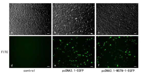 The Images of muscle cells after transfection at 24 h; bar = 100 µm. Transfection efficiency of muscle cells isolated from skeletal muscle of Japanese flounder and cultured with Dulbecco’s Modified Eagle Medium (DMEM) supplemented with 10% fetal bovine serum (FBS) at 23 °C for 24 h. Cells were treated with PBS (a,d) and transfected with pcDNA3.1-EGFP plasmid (b,e) and pcDNA3.1-MSTN-1-EGFP plasmid (c,f). Fluorescence image showed a certain number of EGFP-expressed cells of pcDNA3.1-EGFP group (28.99% ± 2.04%) (e) and pcDNA3.1-MSTN-1-EGFP group (28.62% ± 1.50%) in the fluorescein isothiocyanate (FITC) channel (f).
