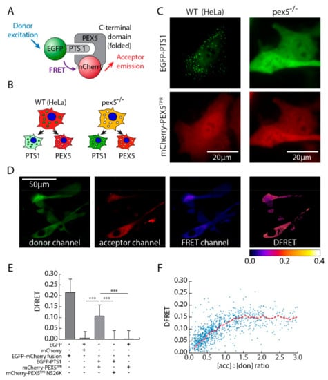 The following are available online at https://www.mdpi.com/2073-4409/9/11/2381/s1, Figure S1: Acceptor bleaching of the mCherry-EGFP fusion protein, Figure S2: Flow cytometry based measurement of FRET, Figure S3: Determination of correction factors for normalization, Figure S4: Independent fitting of cell populations expressing different overall levels of donor and acceptor proteins, Figure S5: Analysis of the effect of the linker domain, Figure S6: Investigation of the interaction between PEX5TPR and different PTS1 variants, Figure S7: Systematic comparison of results from the investigation of the interaction between PEX5 and diverse PTS1, Figure S8: Competition experiments using either Cerulean-PTS1 (weak, Hs57) or Cerulean alone, Figure S9: Primary data for the experiments described in Figure 5, Figure S10: Primary data for the competition experiments described in Figure 5, Figure S11: Benchmarking, Table S12: Table of oligonucleotides used in this study, Table S13: Table of plasmids used in this study, Text S14: Extended Materials and Methods.
