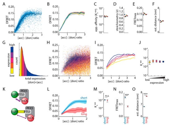 For better visualization, individual values were also aggregated into bins along the x-axis and independent repetitions of this experiment resulted in very similar curves demonstrating the high reproducibility of this method (Figure 2B and Supplementary Figure S3). Next, these data sets were independently subjected to the fitting algorithm to extract Kaapp (Figure 2C), z (Figure 2D), and FRETmax (Figure 2E) for each of the data sets (Supplementary Text S14.3.7.) [30]. The predicted values were very similar as was the predicted distance between donor and acceptor molecules in the complex (Figure 2F), which can be recalculated from FRETmax values based on the relation between distance and transfer efficiency in FRET experiments (Supplementary Text S14.3.8.) [38]. It is important to note that distances measured via FRET, especially for large fluorescent proteins, represent rough estimates and should only be viewed as relative measures. Kaapp is a correlative measure for the interaction strength and is directly related to the Ka, but cannot be simply recalculated unless the proportionality factor relating the measured intensity and the real protein concentration is known (for detail, [30]). The whole procedure as specified above is termed FlowFRET from here on. Large data sets were also required to confirm predictions of our mathematical model, which suggests that DFRET values change with the total amount of donor and acceptor protein, thus affecting the progression of saturation curves [30]. We performed a similar FlowFRET experiment using another EGFP-PTS1 variant (-IAMNCVQCKSQL, Hs50, [12]) with lower affinity for PEX5, which should increase the differences in curve progression upon changes in total protein level. The data set was subdivided into five groups according to the combined intensity of donor and acceptor molecules (Figure 2G, Supplementary Figure S4). The different groups were well separable when the DFRET values were plotted against the acceptor-to-donor ratio (Figure 2H), but also when the data set for each group was depicted as independent saturation curves (Figure 2I). Nonetheless, when these data sets were fitted independently, the predicted Kaapps were very similar (Figure 2J). This confirmed that DFRET values depend on the total amount of interacting proteins, but also demonstrated the power of the fitting approach.