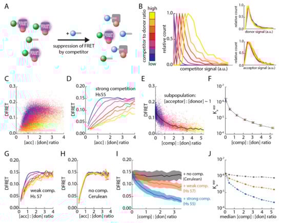 The shape of the resulting curve clearly resembles the logarithmic decay of a traditional inhibitory curve. Next, the data sets of the subgroups were fitted independently and their Kaapps were plotted against the competitor to donor ratio resulting in a similar decay curve (Figure 4F). Finally, we compared the effects of competitors with different binding strengths by expressing a Cerulean-PTS1 variant with a drastically lower affinity to PEX5 (Hs57, cf. Figure 3) or Cerulean alone. Similar FlowFRET competition experiments were performed and the saturation curves reflecting different competitor-to-donor levels obtained for Cerulean-PTS1 (Hs57) were clearly different from each other (Figure 4G, Supplementary Figure S8), but more similar than the curves observed with the high affinity competitor Cerulean-PTS1 (Hs55). In contrast, when Cerulean alone was used as competitor, the saturation curves were indistinguishable (Figure 4H, Supplementary Figure S8E–H). Using subgroups with a donor-to-acceptor level around one, we found that the decay of DFRET values with increasing competitor-to-donor ratio was steepest for the high affinity competitor (Hs55), less steep for the low affinity competitor (Hs57), and Cerulean alone did not change DFRET across the whole range of competitor to donor ratios (Figure 4I). Correspondingly, the predicted Kaapp values of independently fitted subpopulations were reduced most effectively by the high affinity competitor (Hs55), and less effectively by the weak affinity competitor (Hs57), but were not reduced by Cerulean alone (Figure 4J).