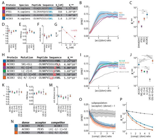 The upstream sequence of PTS1 motifs strongly modulates the interaction strength with PEX5: (A) Peptide sequences encoding PTS1 motifs of human proteins terminating with -SKL; the affinity of the peptides obtained by in vitro binding experiments [16], and Kaapps obtained by FlowFRET (described below) are indicated; (B–F) FlowFRET measurements of pex5−/− cells expressing mCherry-PEX5TPR and one of the EGFP-PTS1 variants; saturation curves are depicted together with the quartiles for the PTS1 of ACOX3 (B); fitting the data sets allowed the extraction of Kaapp (C), z (D) and FRETmax (E), from which the distance between mCherry and EGFP was predicted (F); (G) correlation between the apparent interaction strength obtained by in vitro peptide binding assays (depicted as KD) or by FlowFRET (depicted as Kaapp); (H) peptide sequences encoding the PTS1 of human ACOX3 and variants thereof; Kaapps obtained by FlowFRET (below); (I–M) FlowFRET experiment studying the interaction between PEX5TPR and ACOX3 mutants; (I) saturation curves were obtained as before and quartiles for the PTS1 of ACOX3 are indicated; fitting the data sets allowed the extraction of Kaapp (J), z (K) and FRETmax (L), and the distance between mCherry and EGFP in the complex was calculated (M). (N–O) Live-cell competition to investigate the interaction between PEX5TPR and three PTS1 of ACOX3 variants: FlowFRET experiments of pex5−/− cells expressing mCherry-PEX5TPR and EGFP-PTS1 (ACOX3) together with one of the Cerulean-PTS1 variants (ACOX3 (blue), ACOX3--4GS-3/LV (grey) or ACOX3--2LK-1/SE (orange) (N)) were performed as described before; (O) decay of DFRET values with increasing competitor-to-donor ratios using cells with an acceptor-to-donor ratio of around one (0.8 < x < 1.2) and (P) reduction in Kaapp, when different populations of competitor-to-donor ratios are fitted independently. Statistics: One-way ANOVA for log10 of Kaapp (C), z (D) and FRETmax (E), ((C–F): three independent experiments, mean ± sdv); one-way ANOVA for log10 of Kaapp (J), z (K) and FRETmax (L), ((I–M): n = 4); (N–O): n = 105,306 (ACOX3), 105,135 (LK/SE) and 127,442 (GS/LV); *** p < 0.001, ** p < 0.01, * p < 0.05, Description: (B,I) Lines represent binned average, shaded area represents the upper and lower quartiles.