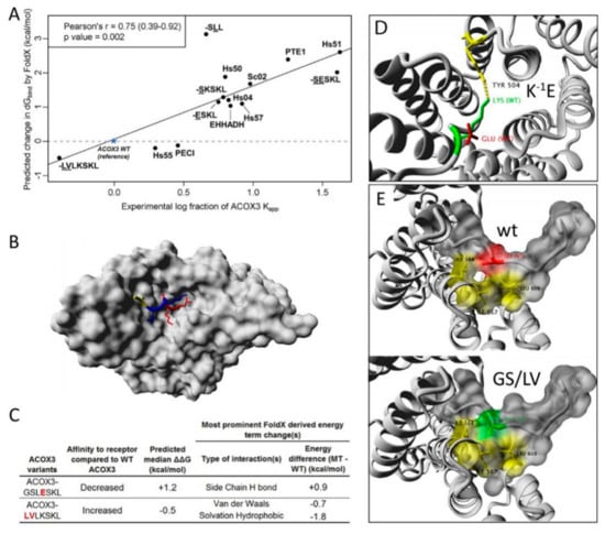 Computational investigation of the interaction between the TPR domain of PEX5 and PTS1 containing peptides: (A) The computationally calculated binding strengths between PEX5TPR and different PTS1 peptides described in Figure 3A and Figure 5A,H correlates with Kaapp values obtained by FlowFRET. The binding strength is predicted by FoldX based on the 3D-structure of human PEX5TPR bound to a PTS1 [43] and expected differences upon replacing the peptide are calculated, which are expressed as change in the binding energy ΔΔG relative to a reference peptide (ACOX3). The Kaapps obtained by FlowFRET experiments are depicted as logarithm of the ratio between the Kaapp of the reference peptide (ACOX3) and the Kaapp of the peptide of interest. Variants of ACOX3 are indicated by the peptide sequence underlining the introduced residues; (B) 3D model of PEX5TPR burying the PTS1 of ACOX3 with the C-terminal tripeptide (red), the residues −1 and −2 (blue) and the upstream sequence −3 and −4 (yellow); (C) prediction of the predominant type of energetic change upon introduction of mutations (red) using FoldX; (D,E) putative rearrangement of side chains at the interphase upon introduction of the mutations: the point mutation K-1E ablates the hydrogen bond to tyrosine (Y504) (D), whereas the double mutation -4GS-3/LV introduces a hydrophobic surface facilitating an additional hydrophobic interaction with PEX5 (red: serine, green: valine, (E)).