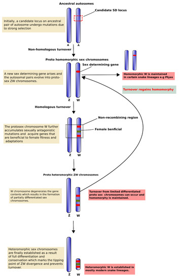 - Augstenová, B.; Johnson, P.M.; Altmanova, M.; Frynta, D.; Rovatsos, M.; Kratochvil, L. ZW, XY, and yet ZW: Sex chromosome evolution in snakes even more complicated. Evolution 2018. [Google Scholar] [CrossRef] [PubMed]