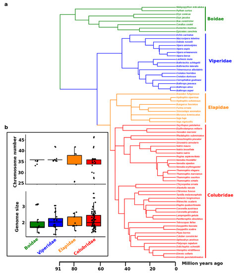 - Oguiura, N.; Ferrarezzi, H.; Batistic, R.F. Cytogenetics and molecular data in snakes: A phylogenetic approach. Cytogenet. Genome Res. 2009, 127, 128–142. [Google Scholar] [CrossRef]