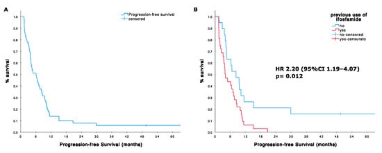The median PFS was 6.1 months (95%CI 3.7–8.5; range 1–195 months). The 4- and 6-month PFS were 61% (95%CI; 47–75) and 51% (95% CI, 37–65), respectively. PFS was significantly better in the group of patients treated in first line compared with patients treated in second or further line (median 6.2 months, 95%CI 2.8–9.7 vs. 3.1, 95%CI 0–6.8; HR 0.369, 95%CI 0.141–0.966, p = 0.042, Figure 1, Table 4). Interestingly, poor histological response to former induction chemotherapy was not associated with significant inferior PFS (HR 0.939, p = 0.833). On the contrary, prior standard-dose ifosfamide treatment negatively affected PFS (median 3.9, 95%CI 2.3–5.4 vs. 8.2, 95%CI 3.7–12.7; HR 2.20, 95%CI 1.19–4.07, p = 0.012). No significant differences were observed according to age, sex, ECOG, and pattern of metastases.