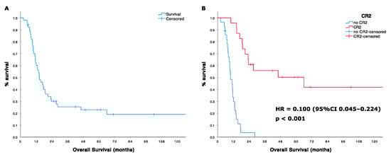 (A) Overall survival (OS) in 51 patients treated with high dose ifosfamide; (B) OS according with surgical, second complete remission (CR2) status.