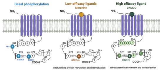 Figure 1. The MOR phosphorylation barcode. MOR residues and kinases involved in constitutive phosphorylation (basal) or upon low and high efficacy agonist-induced phosphorylation (e.g., morphine and DAMGO).