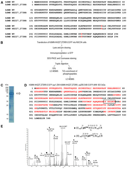 Full-length human SMN comprises 294 amino acid residues. Here, we aimed to analyze phosphorylation of the C-terminus. Tryptic digestion of SMN resulted in long peptides, which could not be analyzed by mass spectrometry (MS). Therefore, we employed a strategy that would increase MS accessibility to the C-terminal region of human SMN (hSMN), whereby we introduced two trypsin cleavage sites into a hSMN-EGFP construct through site-directed mutagenesis (denoted as HH227, 273RR; Figure 1A). The linker between SMN and EGFP introduced an additional arginine residue as a potential additional tryptic cleavage site. We then expressed this construct in differentiated motoneuron-like NSC34 cells and immuno-purified the mutated hSMN-EGFP protein with a GFP antibody bound to magnetic beads. After washing, we eluted the purified hSMN-EGFP fusion protein in reducing Laemmli buffer and analyzed its expression by SDS-PAGE and Coomassie staining followed by in-gel tryptic digestion (Figure 1B,C). To identify the protein composition of the gel band, 10% of the sample was analyzed directly by liquid chromatography MS/MS (LC-MS/MS) measurement. We detected hSMN-EGFP as the top protein with 27 unique peptides (p < 0.01) and a protein coverage of 43% (Figure 1D). Interestingly, the C-terminal peptide 289CSHSLNCR296 of hSMN was also identified (of which C295 and R296 are part of the linker sequence; Figure 1D). This peptide contains two putative phosphorylation sites within hSMN (S290 and S292) as predicted by NetPhos 3.1 analysis [41]. We were able to detect both sites (289CpS290HSLNCR296 and 289CSHpS292LNCR296) after phospho-peptide enrichment with TiO2 beads (Figure 1E). Together, we confirmed for the first time the putative phosphorylation residues hSMN S290 and S292 as novel SMN phosphorylation sites.