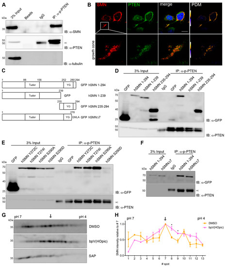 Endogenous phosphatase and tensin homolog (PTEN) binds to the C-terminus of SMN and dephosphorylates SMN. (A) Co-immunoprecipitation of endogenous p-PTEN and SMN from lysates of differentiated NSC34 cells. Beads alone, IgG and tubulin were used as negative controls. HC represents heavy chain. (B) Confocal images of NSC34 cells were stained for endogenous SMN and PTEN together with their respective PDM images. Scale bar represents 20 µm. (C) Schematic overview of hSMN constructs used in immunoprecipitation assays. Cells were transfected and prepared for the assay 18 h post-transfection. (D–F) Co-immunoprecipitation assays with hSMN deletion constructs (D), patient mutations (E) and SMNΔ7 (F) 18 h post-transfection. (G,H) Isoelectric focusing of SMN from NSC34 cells treated with either DMSO, PTEN inhibitor bpV(HOpic) or shrimp alkaline phosphatase (SAP) for 2 h prior to lysis. Spot #7 (indicated by arrow) was used as reference (mean ± SEM, n = 3, paired two-tailed t-test, * p < 0.05).