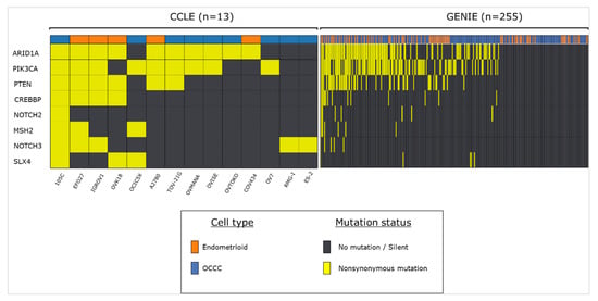 Frequency of 105C cell line-related mutations in endometrioid and OCCC tumour samples and cell lines. Using publicly available datasets we assessed the mutational status of genes that we previously characterized as mutated in the 105C cell line. Cell line data was obtained using CCLE database and tumor sample information was obtained from the GENIE database.