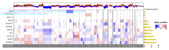 Previous studies have highlighted that EOC subtypes differ with respect to genomic stability: HGSC exhibit a high level of genomic instability due to mutated DNA repair pathways which results in a large proportion of their genome undergoing copy number variation, whereas the OCCC and endometrioid subtypes are generally much more stable and show far less copy number alteration [43,58]. We assessed the level of genomic variation in eleven OCCC cell lines and found that they exhibited a wide-range of copy number variation (ranging from 0.88% to 73.5%, (Supplementary Table S2) with three cell lines (KOC-7c, TOV-21G, and 105C) possessing remarkably unaltered genomes (0.88%, 7.46%, 8.12% of genome altered, respectively)) which puts them into the CIN-low arm of OCCC defined by Uehara and co-workers [59]. It is of note that the three OCCC cell lines which carry PTEN and PIK3CA mutations show the lowest levels of genomic instability. Numerous reports have indicated that loss of PTEN activity is mechanistically linked to loss of genomic stability; therefore, it is surprising that the 105C, KOC-7c, and TOV-21G cell lines show the lowest level of genomic instability relative to the other OCCC cell lines [60,61,62,63]. We also compared the 105C cell line copy number profile to the GENIE dataset and found that OCCC tumour samples contain less in the way of CNA, on average, than what is observed in OCCC cell lines. This can be explained by the fact that copy-number analysis of tissues is complicated by the presence of tumor stroma as well non-tumour tissue obfuscating the ‘true’ copy-number change, which is often higher [64].