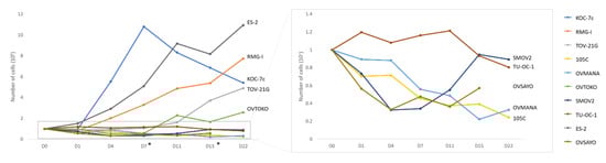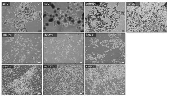- Provencher, D.M.; Lounis, H.; Champoux, L.; Tétrault, M.; Manderson, E.N.; Wang, J.C.; Eydoux, P.; Savoie, R.; Tonin, P.N.; Mes-Masson, A.M. Characterization of four novel epithelial ovarian cancer cell lines. In Vitro Cell Dev. Biol. Anim. 2000, 36, 357–361. [Google Scholar] [CrossRef]