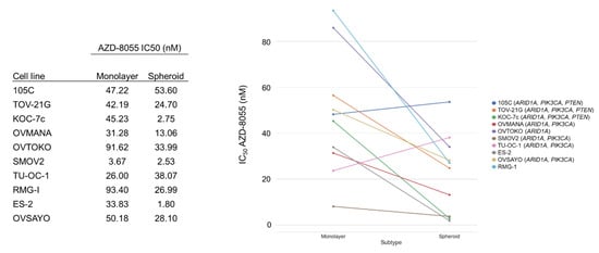 Due to the prevalence of PIK3CA and PTEN mutations in OCCC, inhibition of the mTOR pathway has been postulated as a potential therapeutic target. Recent work by Caumanns et al., has demonstrated that indeed, OCCC cell lines are exceptionally sensitive to AZD-8055, an mTORC1/2 inhibitor, which was able to disrupt OCCC tumor growth in vivo [26]. While the sensitivity of cells grown in monolayer is clear, whether this sensitivity extends to OCCC spheroids remains to be elucidated. Previous work has also shown that PIK3CA activating mutations alone do not correlate with the sensitivity of a cell line to mTOR inhibition, but the impact of co-mutations in PIK3CA and PTEN, which correlate with elevated pAKT levels, has not been assessed [34,35,36,37]. To determine the sensitivity of OCCC spheroids and if PIK3CA/PTEN mutations play a role in mediating this sensitivity, 10 OCCC cell lines were cultured as monolayers or spheroids in suspension for 48 h and then treated for 72 h with a range of AZD-8055 concentrations to determine the IC50 for each line for each culture condition (Figure 10 and Supplementary Figure S2). To ensure that mTOR pathway inhibition was maintained over the course of the experiment, the 105C cell line was treated with AZD-8055 and phosphorylation of AKT was monitored over 4 days by western blot which demonstrated complete loss of the pAKT signal at 1 µM and significantly reduced pAKT at the IC50 (Supplementary Figure S3). Remarkably, we find that OCCC cell lines generally exhibit increased sensitivity to mTOR inhibition in suspension cultures, compared to monolayer. No obvious relationship was found between the sensitivity to AZD-8055 and the mutation status of PIK3CA and/or PTEN, and unexpectedly, we found that a subset of OCCC cell lines proliferate while in suspension and it is this phenotype that may sensitize them to AZD-8055-mediated mTOR inhibition. Interestingly, the 105C line is one of the few cell lines that did not show an obvious increase in sensitivity to mTOR inhibition in suspension cultures compared to those cultured as monolayers.
