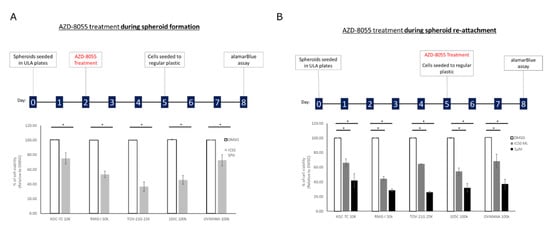 AZD-8055 reduces OCCC cell line viability during spheroid formation and spheroid reattachment. (A) Cells were seeded into 24-well ULA plates for 48 h and then treated with DMSO, the AZD-8055 spheroid IC50 for each cell line respectively or 1 μM AZD-8055 for 72 h. Spheroids were then reattached for 72 h into 24-well regular tissue culture plastic at which point viability was assessed by alamarBlue assay. (B) Cells were seeded into 24-well ULA plates for 5 days. Spheroids were then treated at the time of reattachment into 24-well regular tissue culture plastic with DMSO, the AZD-8055 monolayer IC50 for each cell line respectively or 1 μM AZD-8055. 72 h after reattachment viability was assessed by alamarBlue assay. Viability data was normalized to DMSO-treated controls set to 100%. A one-way ANOVA with Tukey’s multiple comparisons test was performed to determine statistical significance for each cell line (*, p < 0.05) (n = 3).