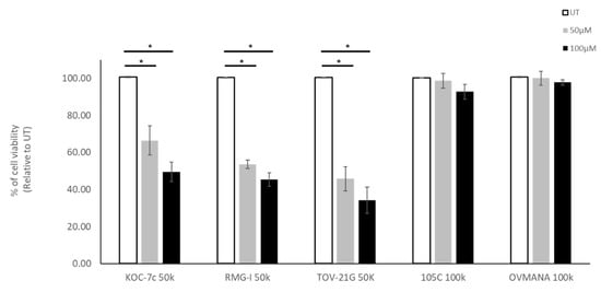 Effect of carboplatin treatment on OCCC cell lines in spheroid culture. Cells were seeded into 24-well ULA plates for 48 h and then treated with 50 μM or 100 μM of Carboplatin. Untreated cells were use as control cultures (UT). Trypan Blue Exclusion cell counting was performed 72 h after treatment. Viability data was normalized to untreated controls set to 100%. A one-way ANOVA with Tukey’s multiple comparisons test were performed to identify statistically significant differences in cell viability for each cell line (*, p < 0.05) (n = 4).