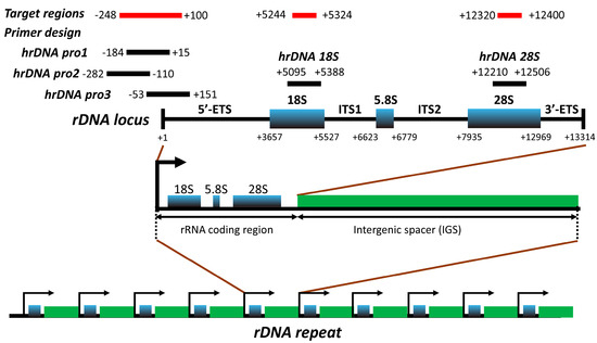 We designed primers to cover three target regions in rDNA (Figure 1 and Table S1): (i) the rDNA promoter from position −248 to +100, which partially overlaps with that previously analyzed in another study [31]; (ii) the 18S rRNA coding region from position +5244 to +5324; and (iii) the 28S rRNA coding region from position + 12,320 to +12,400 (nucleotide positions are in reference to GenBank Accession No. U13369).