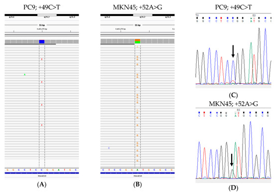 Representative single-nucleotide variations (SNVs) observed in cell lines. (A) PC9; +49C>T (variant allele frequency (VAF]): 8%) and (B) MKN45; +52A>G (VAF: 47%) detected by next-generation sequencing. (C,D) Sanger electropherograms depicting SNVs PC9, +49C>T (C) and MKN45, +52A>G (D).