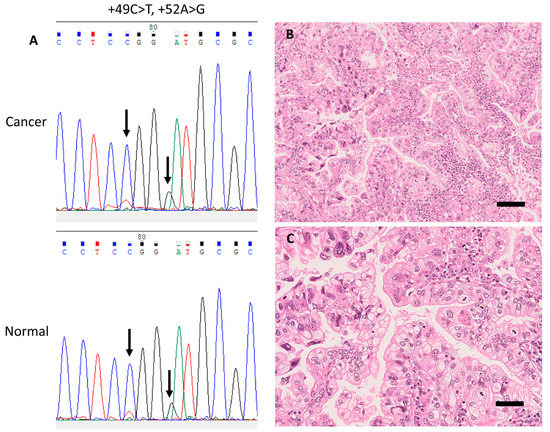 Representative case with a germline single-nucleotide variant (SNV) in the rDNA promoter (case 1). (A) Electropherograms of germline SNVs +49C>T and +52A>G from corresponding cancer (upper panel) and normal (lower panel) tissue samples. (B) Representative histopathological images of this case (H&E stain) showing invasive mucinous carcinoma accompanied with papillary structure, and (C) nuclear pleomorphism and frequent mitoses. Scale bar, 50 μm.