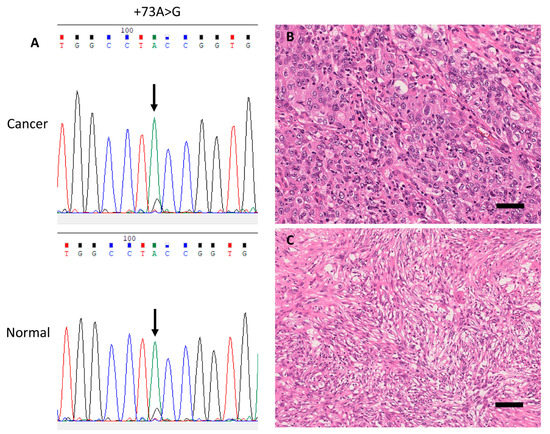 Representative case with a germline single-nucleotide variant (SNV) in the rDNA promoter (case 3). (A) Electropherograms of germline SNV +73A>G from corresponding cancer (upper panel) and normal (lower panel) tissue samples. (B) Representative histopathological images of this pleomorphic carcinoma case (H&E stain) showing a solid predominant phenotype, and (C) sarcomatoid component composed of pleomorphic spindle cells. Scale bar, 100 μm.