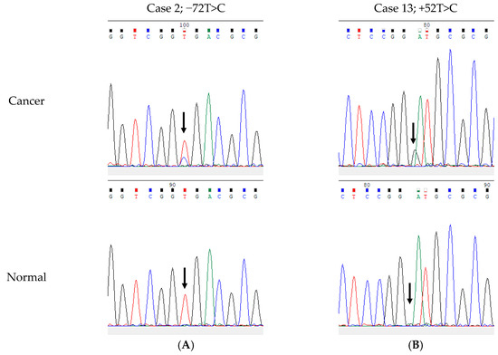 Electropherograms of representative somatic single-nucleotide variants (SNV) in the rDNA promoter region in corresponding cancer tissue (upper panel) and normal tissue (lower panel). (A) SNV −72T>C in case 2 and (B) +52A>G in case 13. Note that there was no apparent additional peak at +49 in both cancer and normal tissues in this case, suggesting that Case 1 harbored +49 germline SNV.